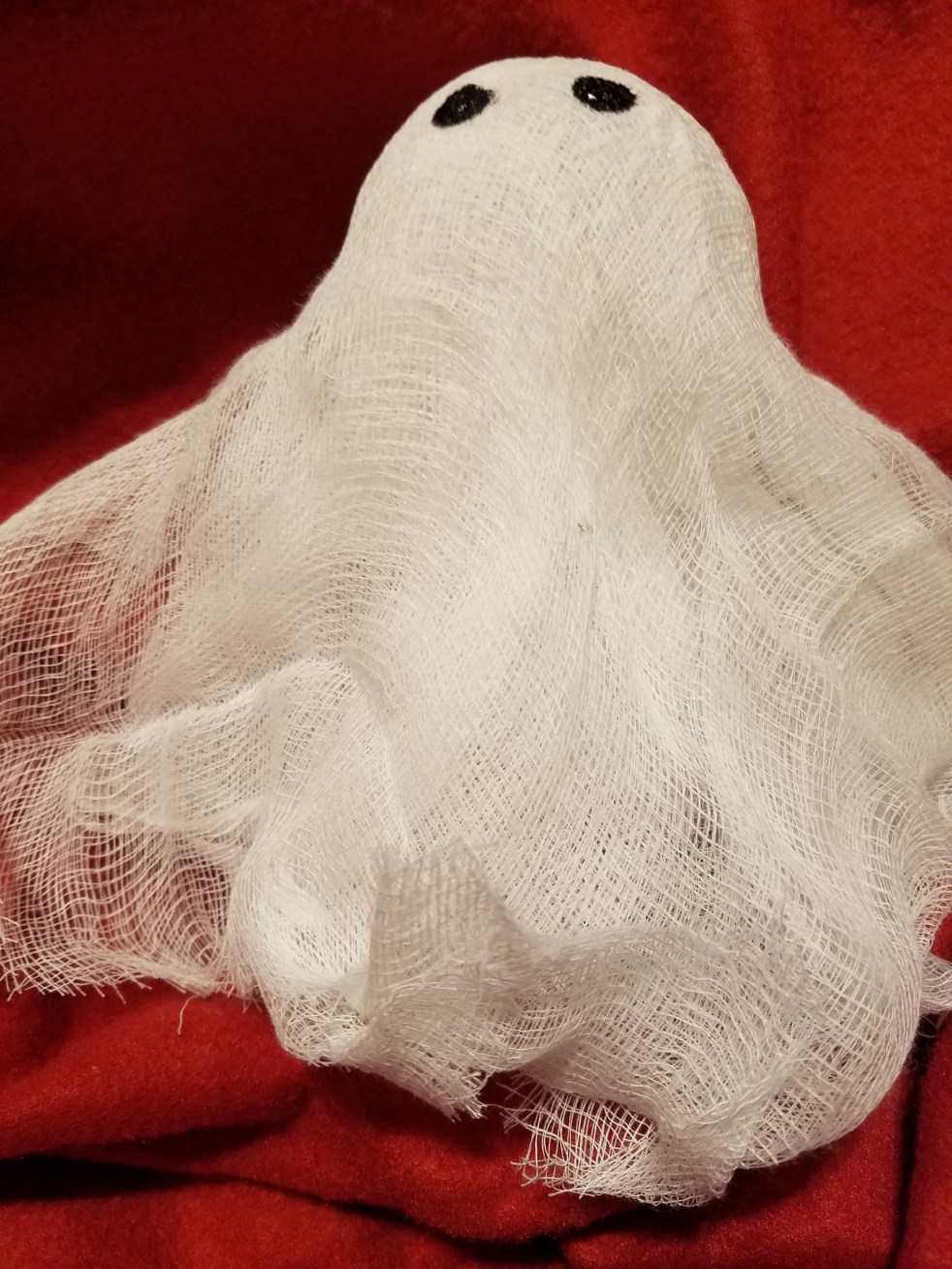 After you give the glue time to dry, you can add eyes to your ghost. You can glue on circles of black felt, add googly eyes, or use paint or markets to create eyes. Note: the black marker bleeds and doesn’t make sharply defined edges. I liked paint foe the eyes. I did not even use a brush. I used an acrylic paint in a tube. The opening of the tube was just the size i wanted for my eye, so i put the tube opening right on the fabric at the site i wanted the eye and gave a gentle squeeze to leave just a dot of paint on the ghost.